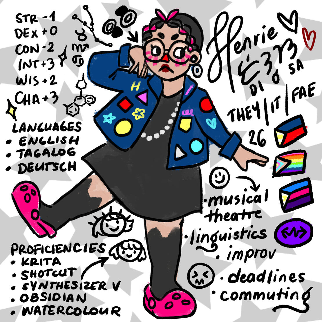 Amateur student, part-time poet, Filipino-in-training, aspiring person.Henrie Diosa is a 26 year old disabled queer artist from Marikina, in the Philippines. They are currently studying under the BA Creative Writing program at the University of the Philippines Diliman. They are a Taurus sun, Scorpio moon, and Cancer rising with an Aries stellium. Their favourite drink is Pocari Sweat, and their favourite food is twenty chicken nuggets.You can support their work on Ko-fi, and see more of it on Tumblr and Instagram.